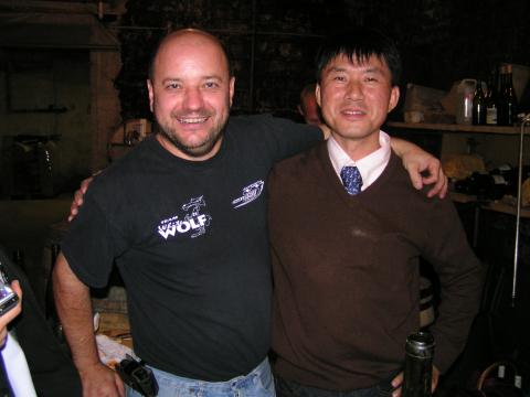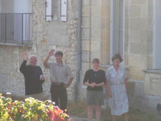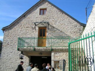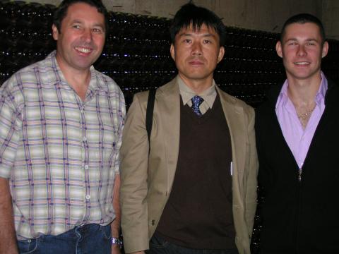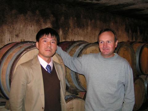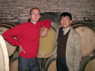 | 当主のアランと記念写真、ここの醸造設備は、日本の小さな清酒の蔵元を見慣れている私が見ても衝撃的なほど、小ぶりです。でも、ワインはおいしいんです。不思議なほど。 | |