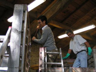 | ピジアージュを体験させてもらっている徳島の多積さん、 櫂棒を突き刺すだけでも一苦労。ましてや回せません。 これは超健康なブドウだからこそなるそうで、ひ弱な ブドウの生産者(有名どころも!)はなんと、スコスコだそうです。 ちなみにアンドロンでの様子では、発酵面に浮いている果房とかに 乗っても普通に立てそうです。 |
