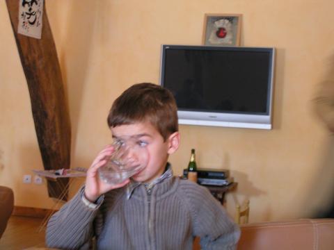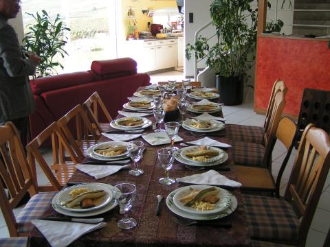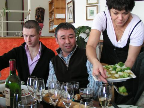 | パトリスの息子さんと和気藹々の昼食(写真中央は岐阜・渡辺屋の主人) | |