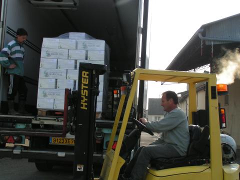 | かないやに送るワインを自らリフトを運転して載せるクロード。丁寧です! | |