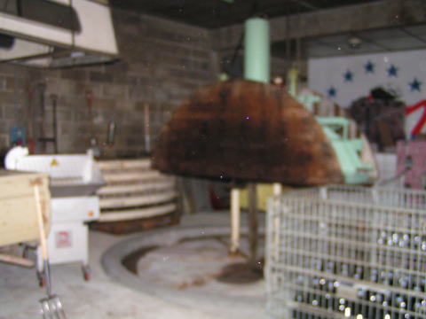 | これがパトリスマルクの搾り機。たらいのような形にする壁をつくってプレス。 円周上の溝には穴が3つ空けられていて、搾り始め、なか、あと、と分けて採取 |